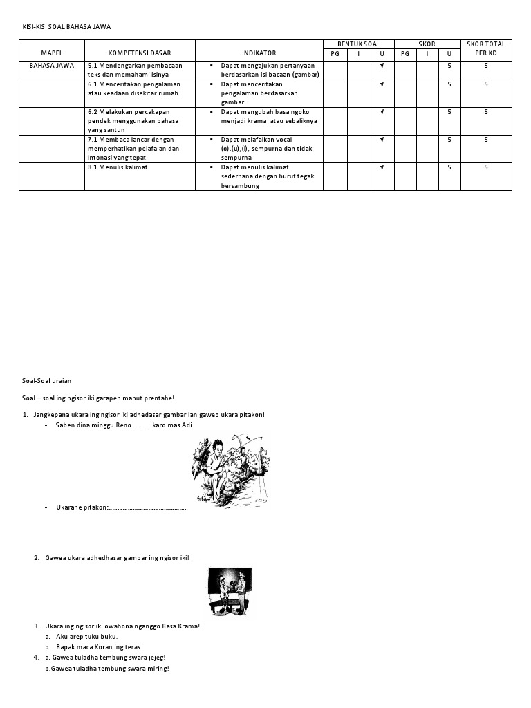 Kula boten sarujuk menawi tiyang dhahar punika kaliyan jumeneng ing ngisor iki kang ora ana gegayutane karo prathelan artikel jawa ing dhuwur yaiku …. Ukara gancaran iku dhapukane kudu kaya ukara kang kanggo pangguneman. Ukara ngisor iki kang migunakake tembung lingga yaiku …. Dina iki aku arep tuku sepatu. Endahing karangan marga cocog pamilihing tembung. Ing ngisor iki ukara sing klebu jenise pariwara/iklan yaiku …… a. Tulisen 2 ukara kang migunakake tembung tanggap. Wangsulane dikirim ing google classroom. Ukara ing ngisor iki kang migunakake basa krama lugu yaiku. Gedhe cilik, lanang wadon, tuwa enom kabeh padha nonton reyog ing bale desa. Ukara gancaran iku dapukane kudu kaya ukara lumrah, yaiku ukara kang kanggo guneman padinan. Ada beberapa soal yang diberikan dalam materi kali ini, salah satunya berbunyi gaweo ukara pitakon gunakake tembung ing. Ac3disajikan soal cerkak kemudian peserta didik mampumenemukan isi, unsur cerkak.24.